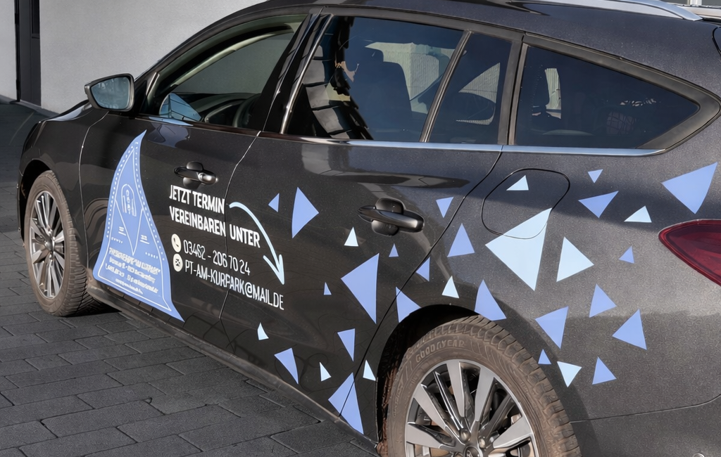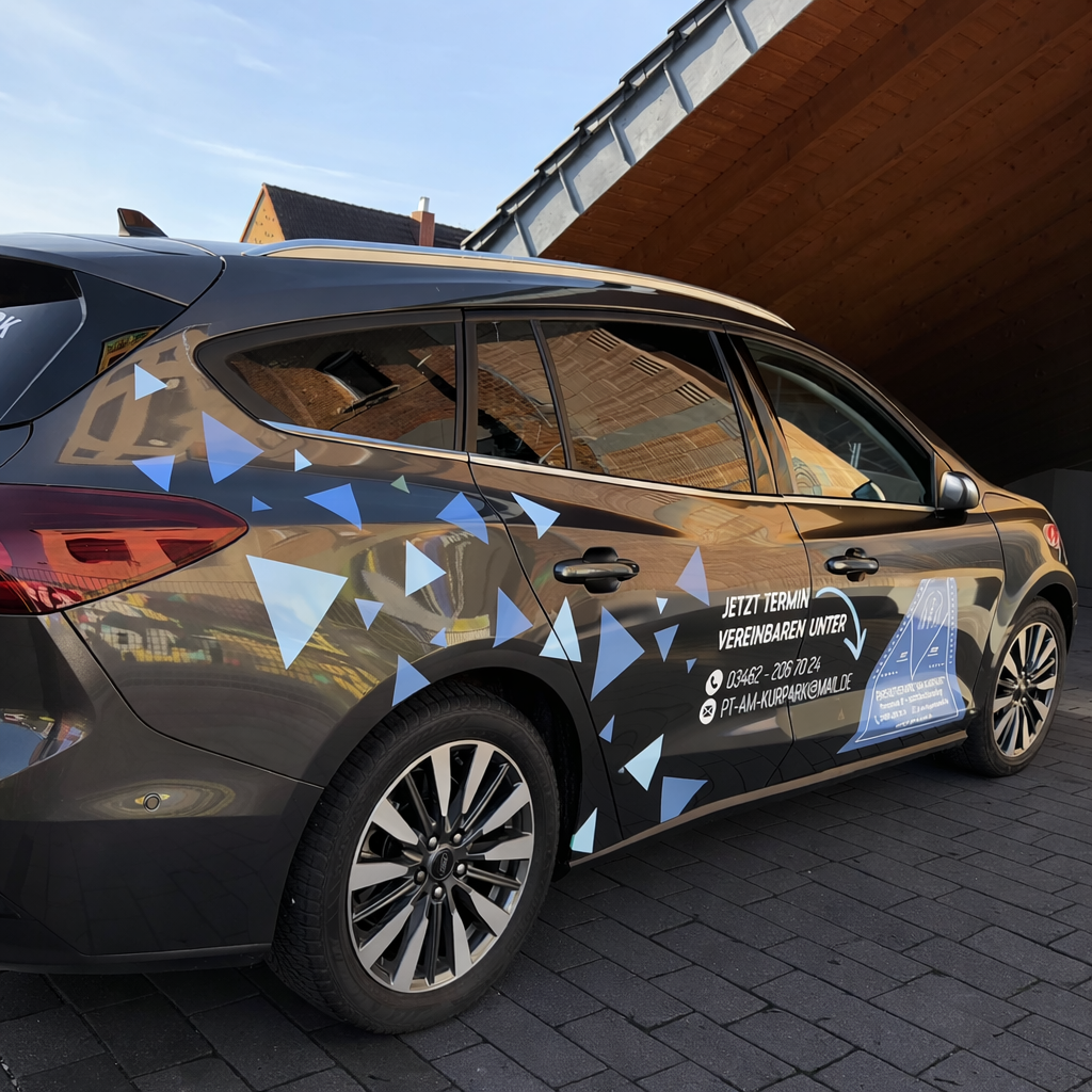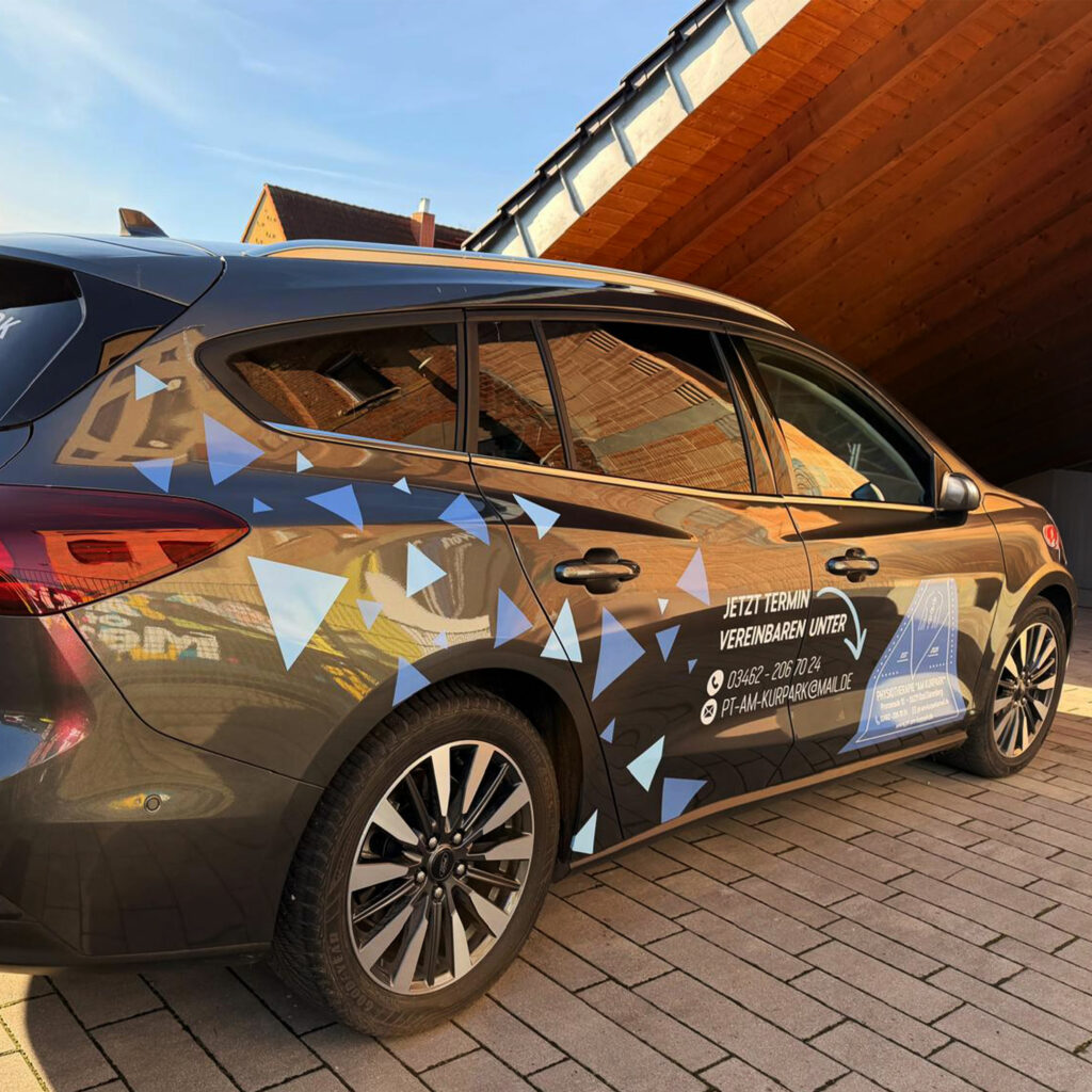 Wir haben für die Physiotherapie am Kurpark einen Ford Focus in ein fahrendes Aushängeschild verwandelt. Die Folierung kombiniert verschiedene Blautöne und nimmt mit Dreiecken die Form des Logos auf – ein echter Hingucker im Straßenbild. Das Design schafft eine klare Verbindung zwischen moderner Therapie und frischem Markenauftritt. Ob unterwegs oder direkt vor der Praxis: Der neue Look bleibt im Kopf. Eine starke mobile Präsenz mit Wiedererkennungswert!