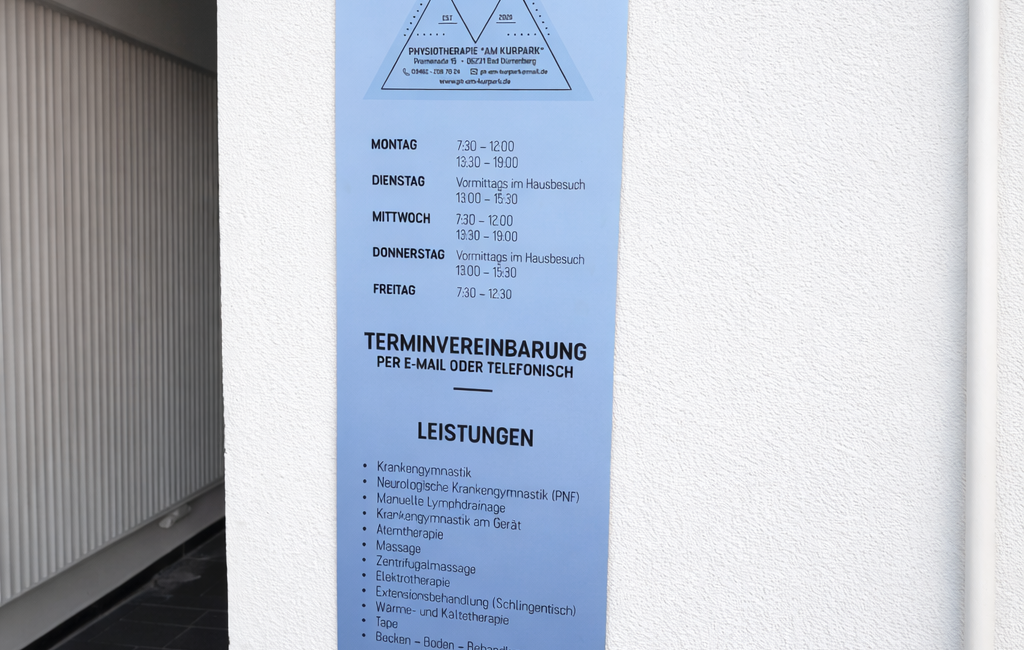 Für die Physiotherapie am Kurpark in Bad Dürrenberg haben wir ein modernes Aluverbundschild gestaltet und produziert. Das klare Layout in beruhigenden Blautönen sorgt für einen professionellen ersten Eindruck – noch bevor man die Tür öffnet. Durch das wetterfeste Material ist das Schild nicht nur optisch ein Gewinn, sondern bleibt auch langfristig ein echter Hingucker. Klare Kommunikation, starke Präsenz – genau so startet man in einen erfolgreichen Praxisalltag. Ein Projekt, das zeigt, wie schon der Eingangsbereich Vertrauen schaffen kann.