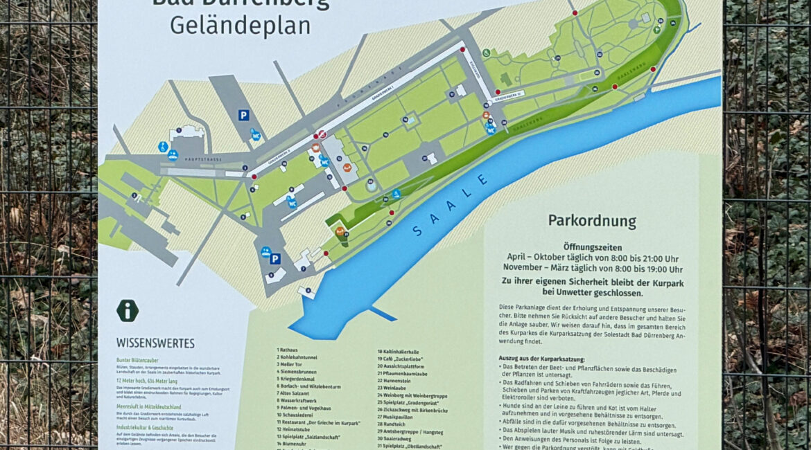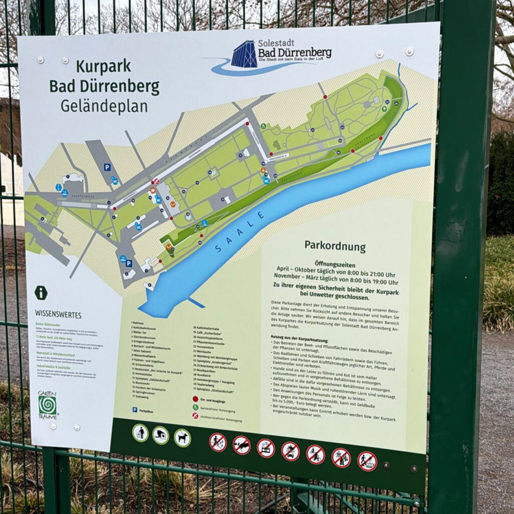 In Bad Dürrenberg durften wir für die Stadt moderne Lagepläne für den Kurpark produzieren und montieren. Ziel war es, Besucherinnen und Besuchern eine klare, stilvolle und leicht verständliche Orientierung zu ermöglichen. Die Schilder wurden hochwertig gefertigt und fügen sich harmonisch in das natürliche Umfeld des Kurparks ein. Neben einer übersichtlichen Gestaltung lag der Fokus auf Langlebigkeit und Wetterbeständigkeit. Ein Projekt, das zeigt, wie durchdachte Beschilderung Funktionalität und Ästhetik perfekt verbinden kann – und öffentliche Orte noch einladender macht.