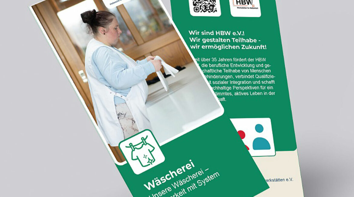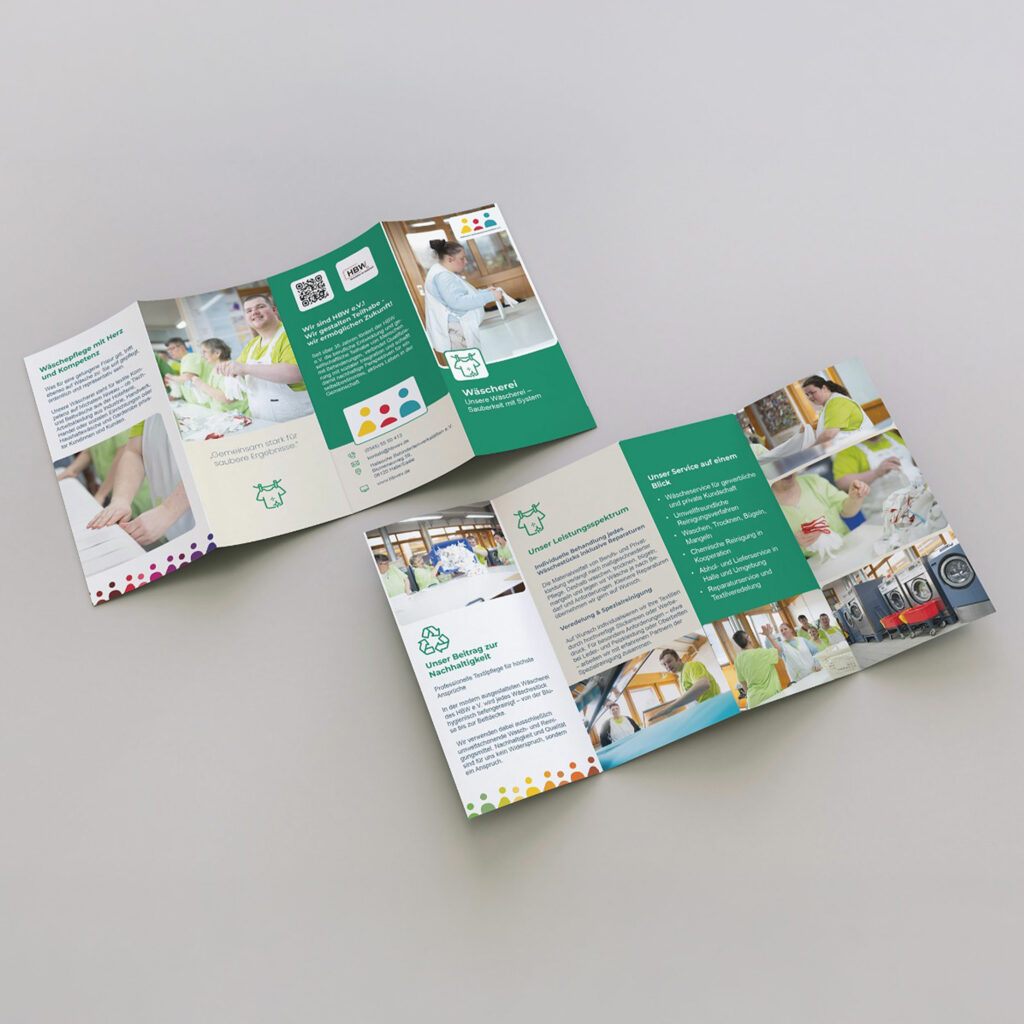 Wir durften wir für die Hallesche Behindertenwerkstatt einen informativen Wickelfalz-Flyer für den Bereich Wäscherei entwerfen. Der Flyer stellt die vielseitigen Dienstleistungen rund ums Waschen, Trocknen, Bügeln und Mangeln übersichtlich dar und transportiert die Botschaft klar und sympathisch. Besonderer Fokus liegt auf der professionellen Ausstattung und dem kundenfreundlichen Service – inklusive Optionen wie Abholung und Lieferservice. Mit einem sauberen und strukturierten Design gelingt es, Vertrauen aufzubauen und Interesse an den Leistungen zu wecken.